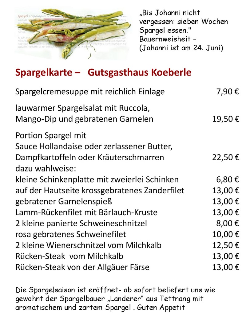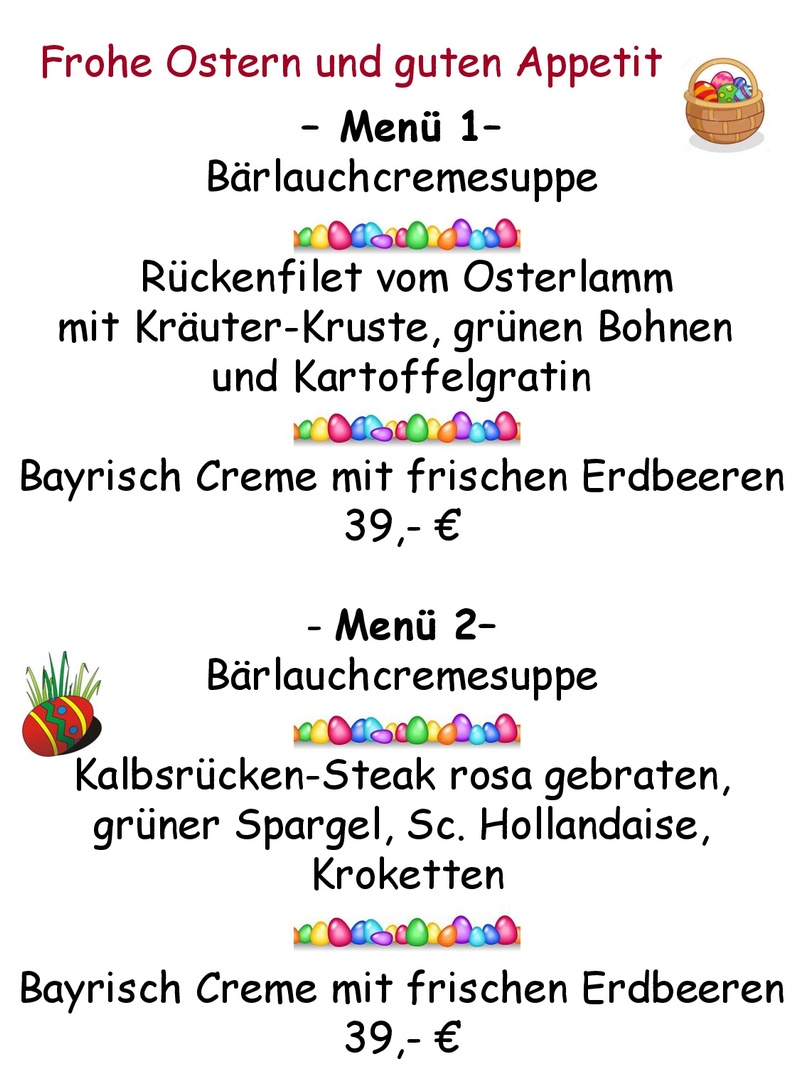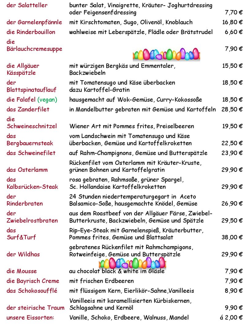 Die Speisekarte hat eine umfangreiche Auswahl an regionalen Gerichten zu bieten. Freuen Sie sich beispielsweise je nach Saison auf leckeren, frischen Bodenseefisch, Zwiebelrostbraten, Wildgerichte, Osterlamm, Kalbsleber, saftige Steaks, Spargel mit hausgemachter Hollandaise, vegetarische und vegane Gerichte, zünftige Brotzeiten.